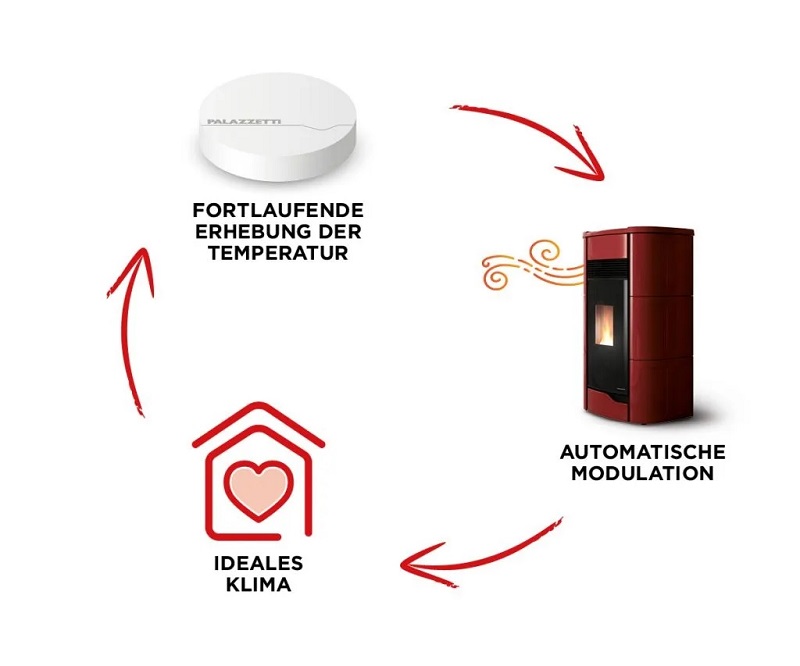 - Sollte dieser vom eingegebenen Wert abweichen, sendet der Sensor ein Signal an den Ofen, der daraufhin die Leistung oder den Warmluftausstoß im Raum erhöht oder verringert (wodurch sich die Temperatur ändert).