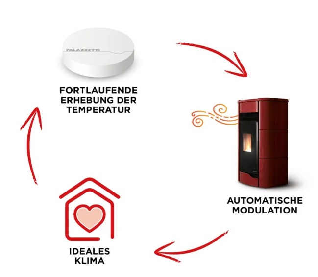 - Sollte dieser vom eingegebenen Wert abweichen, sendet der Sensor ein Signal an den Ofen, der daraufhin die Leistung oder den Warmluftausstoß im Raum erhöht oder verringert (wodurch sich die Temperatur ändert).